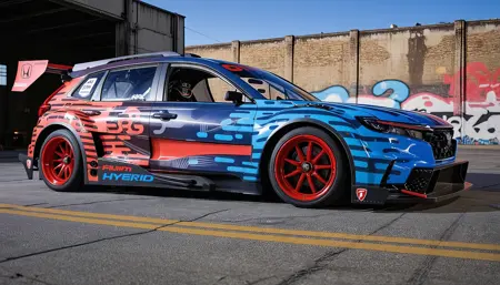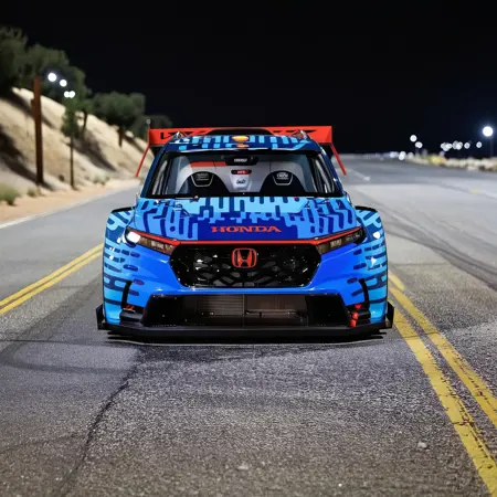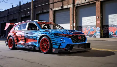 "The graphics were inspired by the hybrid powertrain, radiating from Honda Hybrid Blue to Honda Racing Red to symbolize the duality of the drivetrain," Melikian explained. "While the 'speed squirkles' add a dynamic fun layer and showcase the playful side of Power of Dreams. Throughout the wrap, we have also sprinkled easter eggs like ghosted outlines of Honda-sponsored tracks and an overhead view of the engine that powers the Honda CR-V Hybrid Racer."