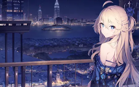 파란 테마, 밤, 야간 하늘, 별이 가득한 하늘, 도시 풍경Blue Archive CG 태거들이 생성한 다른 태그도 시도 가능함.