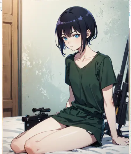 注目タグ:短い髪、青い目、緑の衣装、((((フード付き))))、長い黄緑色のマント、指なし手袋、タクティカルベル、白いズボン、緑のハイブーツ