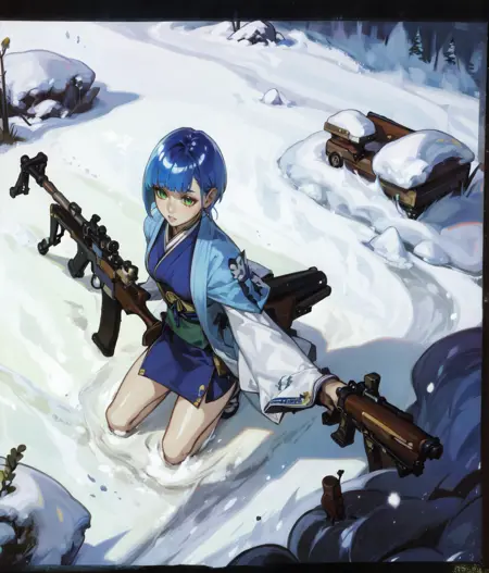 주요 태그: 파란 머리, 짧은 머리, 녹색 눈, 일본 복장, 파란 옷, 다리 노출