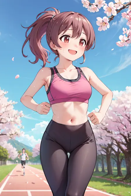 - murosaki miyo,long hair,low twintails,bangs,hair flower,school uniform,neck ribbon,white shirt,long sleeves,suspenders,long skirt,blue skirt,pantyhose,black pantyhose,loafers,brown footwear