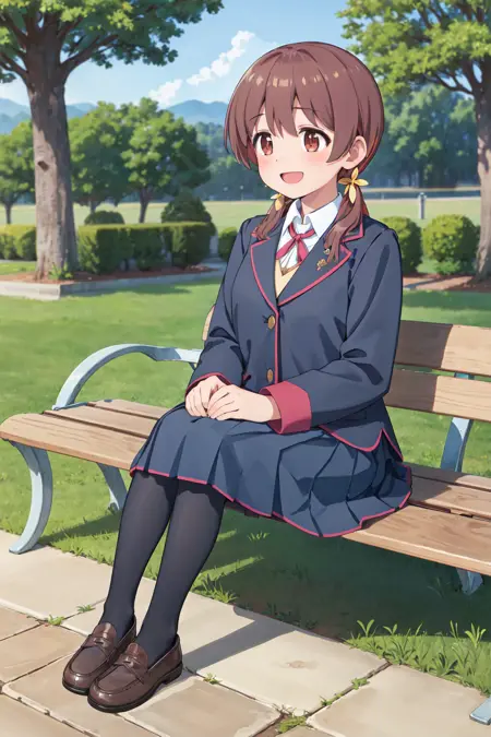 - murosaki miyo,long hair,low twintails,bangs,hair flower,school uniform,jacket,blazer,neck ribbon,white shirt,long sleeves,long skirt,blue skirt,pantyhose,black pantyhose,loafers,brown footwear