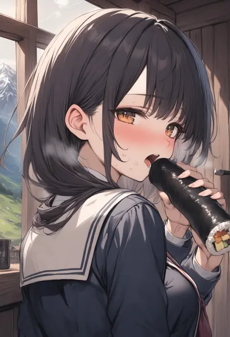 仅使用触发词时,角色可能仅手持惠方卷,若希望其食用,可补充使用 makizushi、eating 等词以增强效果。