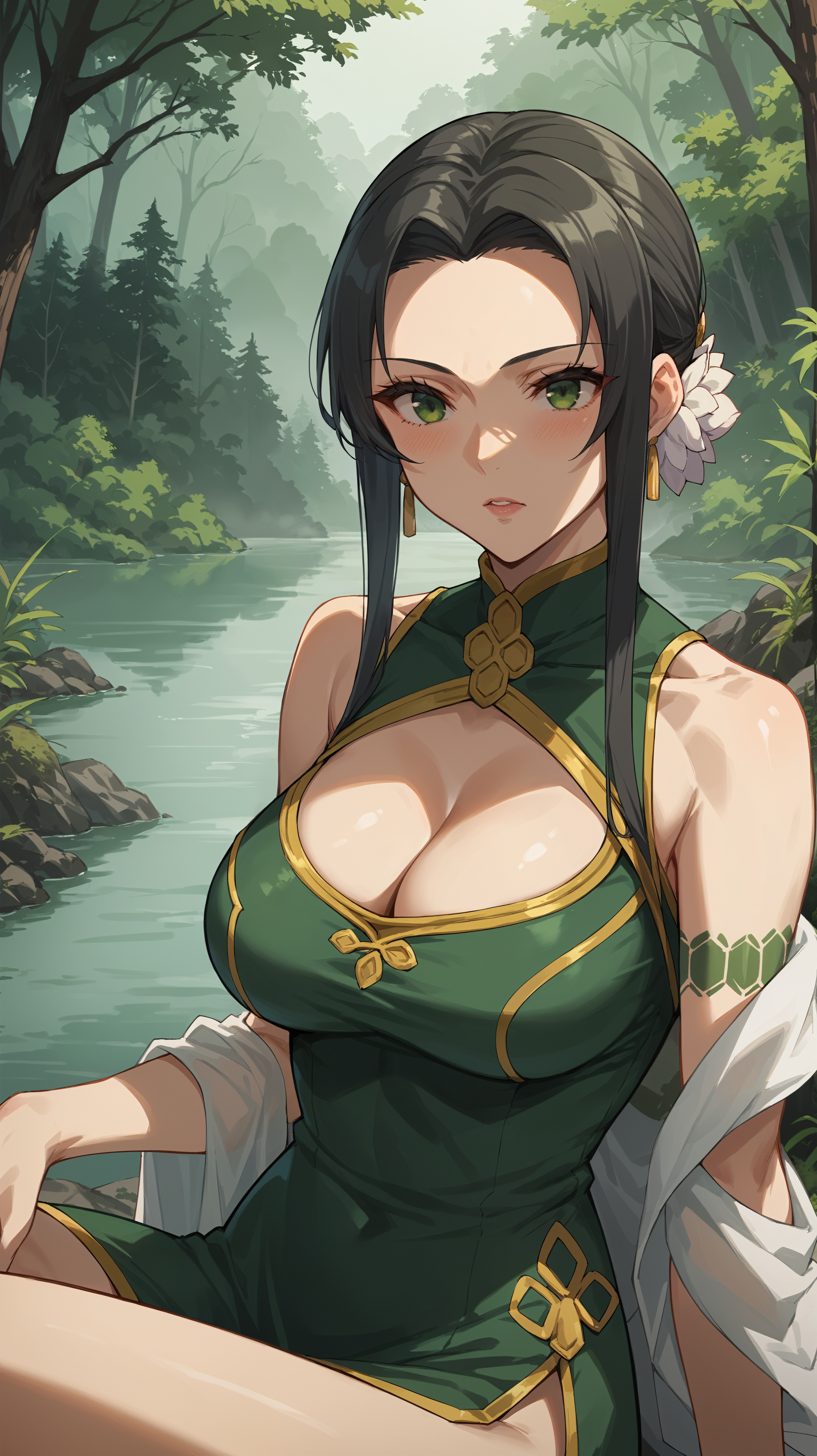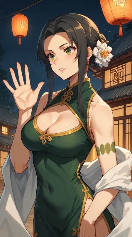 black hair, parted bangs, hair bun, hair flower, green eyes, green chinese dress, cleavage cutout, white shawl,