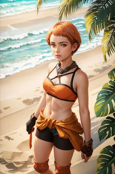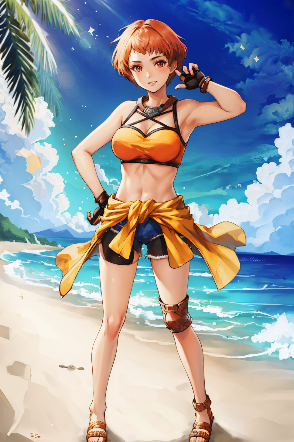 Default appearance: sumLeonie, short hair, bikini, fingerless gloves, shorts, short shorts, bike shorts, clothes around waist, sandals