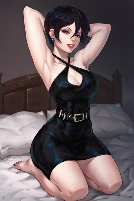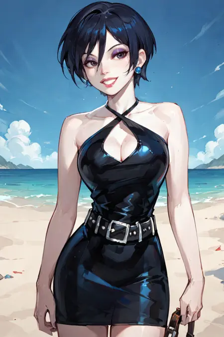 또한: 단발, 아이섀도우, 귀걸이, 검은 드레스, 짧은 드레스, 벨트, 가슴선,