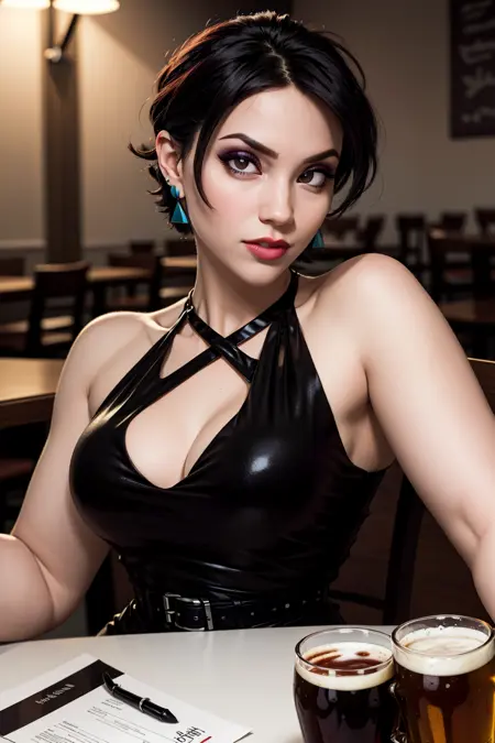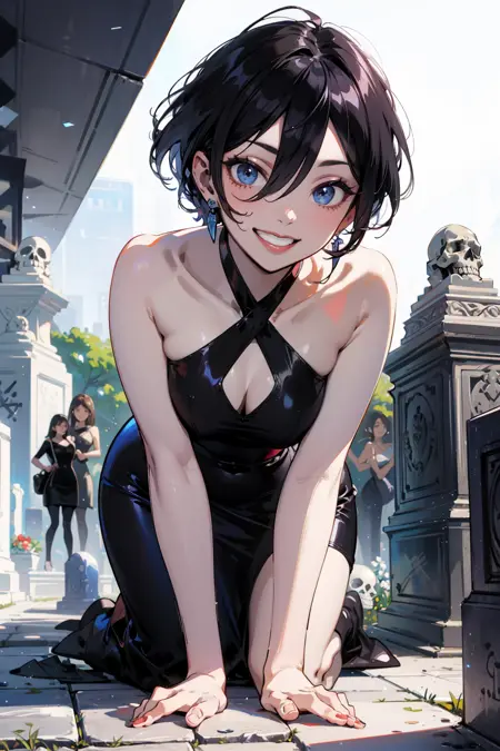 또한: 단발, 아이섀도우, 귀걸이, 검은 드레스, 짧은 드레스, 벨트, 가슴선,