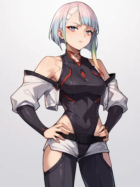 기본 프롬프트: score_9, source_anime, 1girl, lucy \(cyberpunk\), short hair, bangs, multicolored hair, multicolored eyes, red eyeliner, makeup