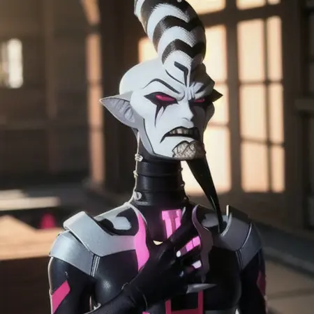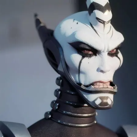 다른 프롬프트: 인간 없음, 남성, 날카로운 이빨, 흰 피부, 메이크업, 검은 입술, 단일 뿔