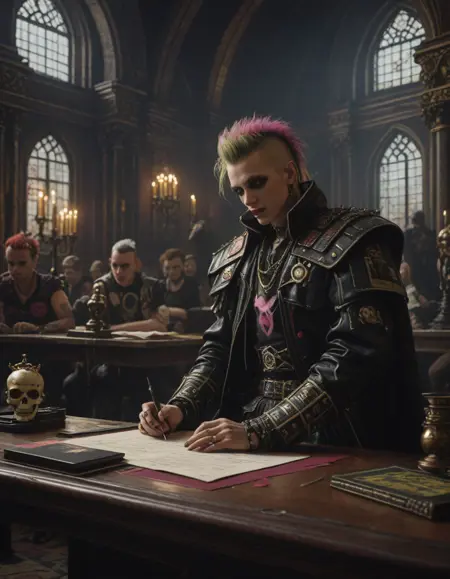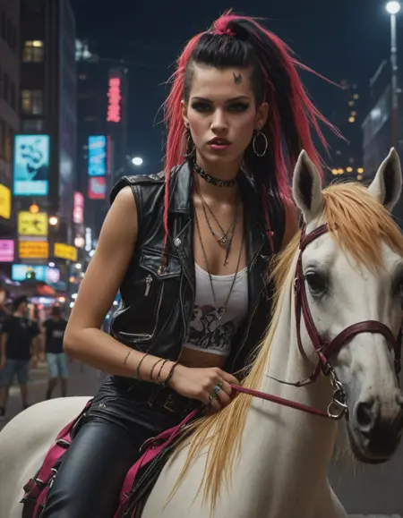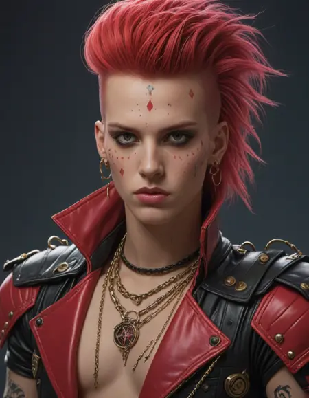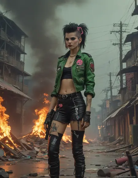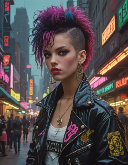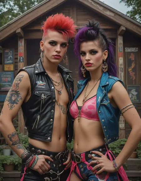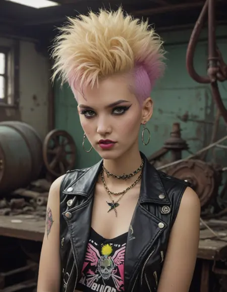 Fight the authority in style with 80s punk clothing or boring drab gray clothing (negative). Images at 4 strength. Use the trigger 80s punk rock clothing