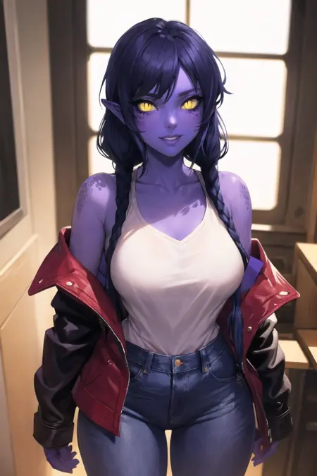 Trigger: "Shyvana, dragon girl, facial mark, pointy ears, yellow eyes, colored sclera, slit pupils, colored skin, (purple skin:1.2), twin braids, low ponytail, long hair" always needed, "toned", "abs" suggested for accuracy and/or taste.