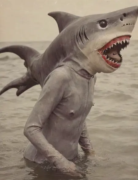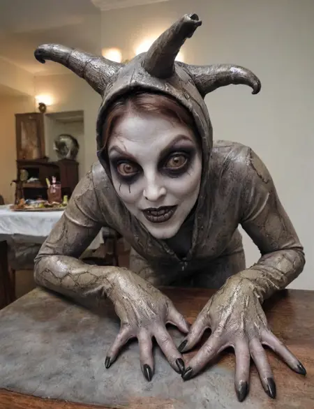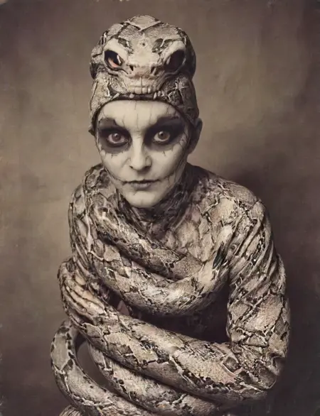 트리거 단어는 없습니다... 약간은. Freak, costume, badly made 및 creepy가 효과를 냅니다. 또한 old photo와 monochrome/sepia를 사용하면 더 생동감이 생깁니다.