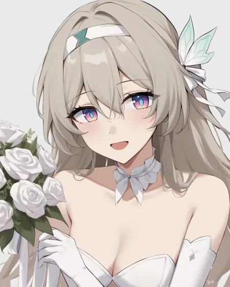 TAG:firefly \(honkai: star rail\),1girl,solo,jacket,white dress,long sleeves,white flower,headband,