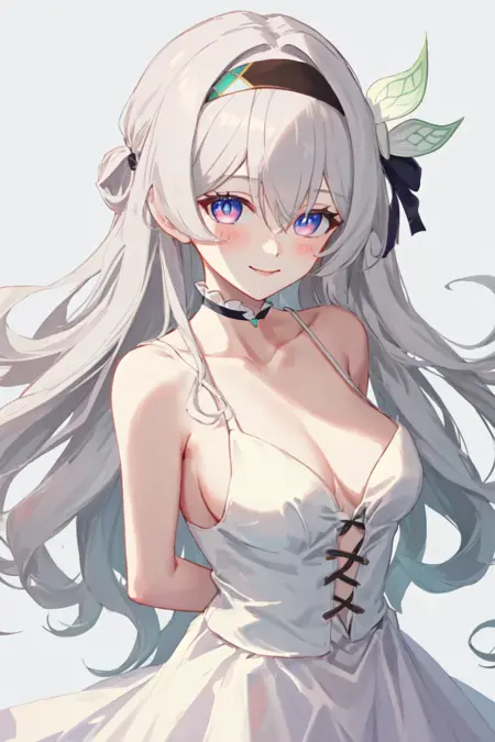 TAG: firefly \(honkai: star rail\), 1girl, solo, , dress, long sleeves, hair ornament,,black hairband, medium breasts