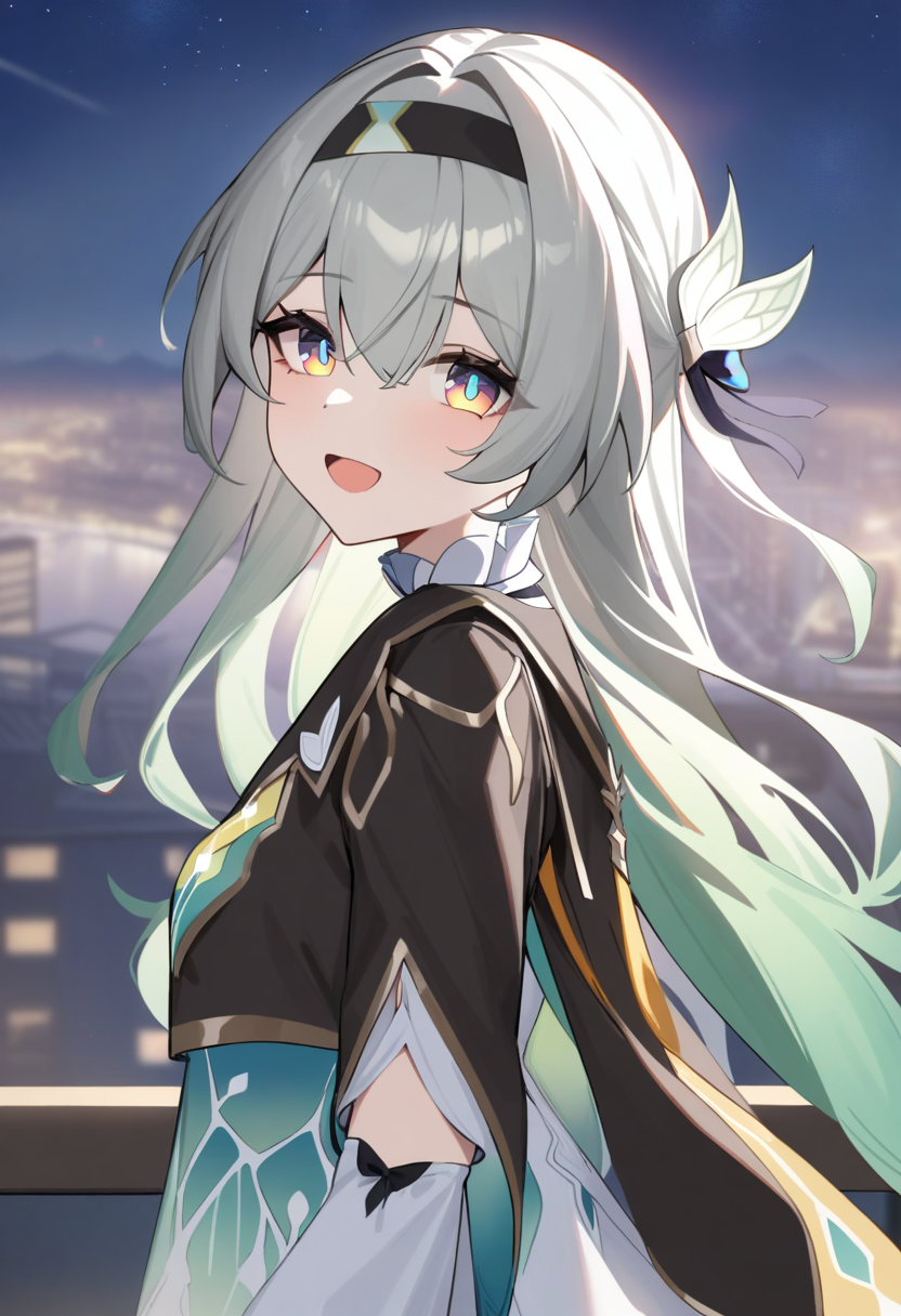TAG: firefly \(honkai: star rail\), 1girl, solo, , dress, long sleeves, hair ornament,,black hairband, medium breasts