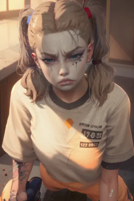 harleyquinssktjlarkham, 白色衬衫, 橙色裤子, 监狱服装, 阿卡姆疯人院, 双发髻, 靴子, 裤子