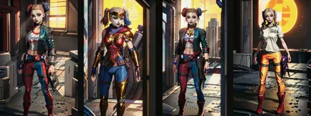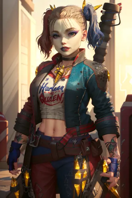 harleyquinnssktjlcrystal, 双发髻, 夹克, 红蓝服装, 夹克, 纹身, 妆容, 项圈, 露脐, 短上衣, 妆容, 靴子, 裤子, 饰品, 黄色水晶