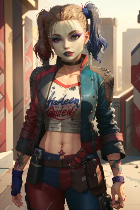 harleyquinnssktjl, 双发髻, 夹克, 红蓝服装, 夹克, 纹身, 妆容, 项圈, 露脐, 短上衣, 妆容, 靴子, 红蓝裤子