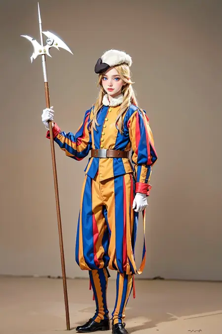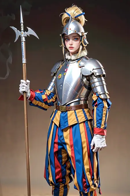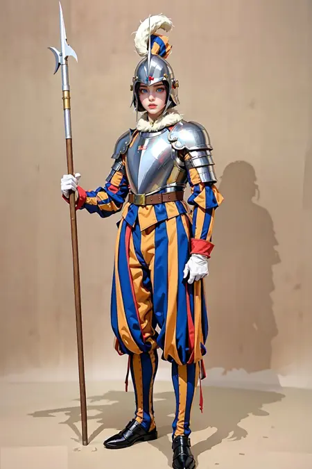 Major Keyword : ((holding polearm:1.2)), belt, striped pants, long sleeves, white gloves, striped, uniform, black footwear, vertical stripes, armor, plume, helmet, breast plate, shoulder armor, pauldrons