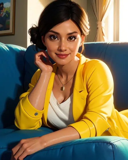 yellow sweater, or white shirt, yellow jacket, necklace, pants,