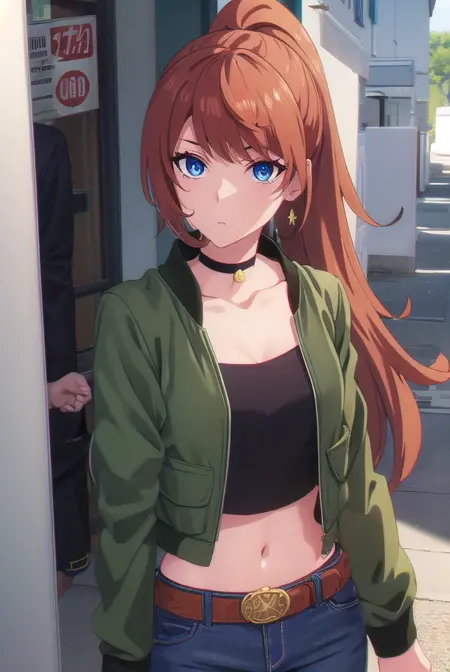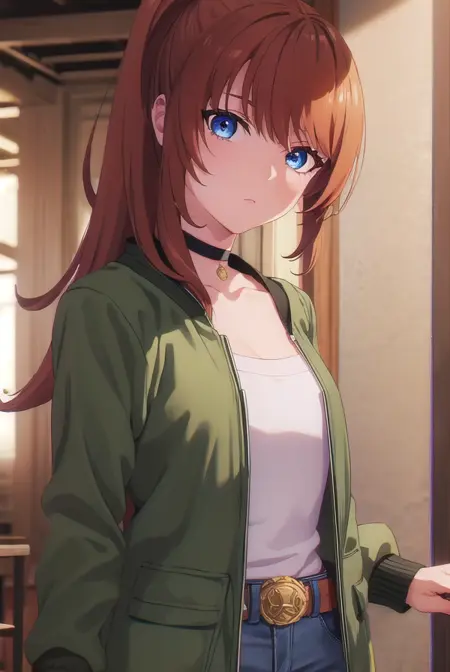 jacket, open clothes, choker, belt, pants, open jacket, black choker, denim, jeans, green jacket, brown belt,
