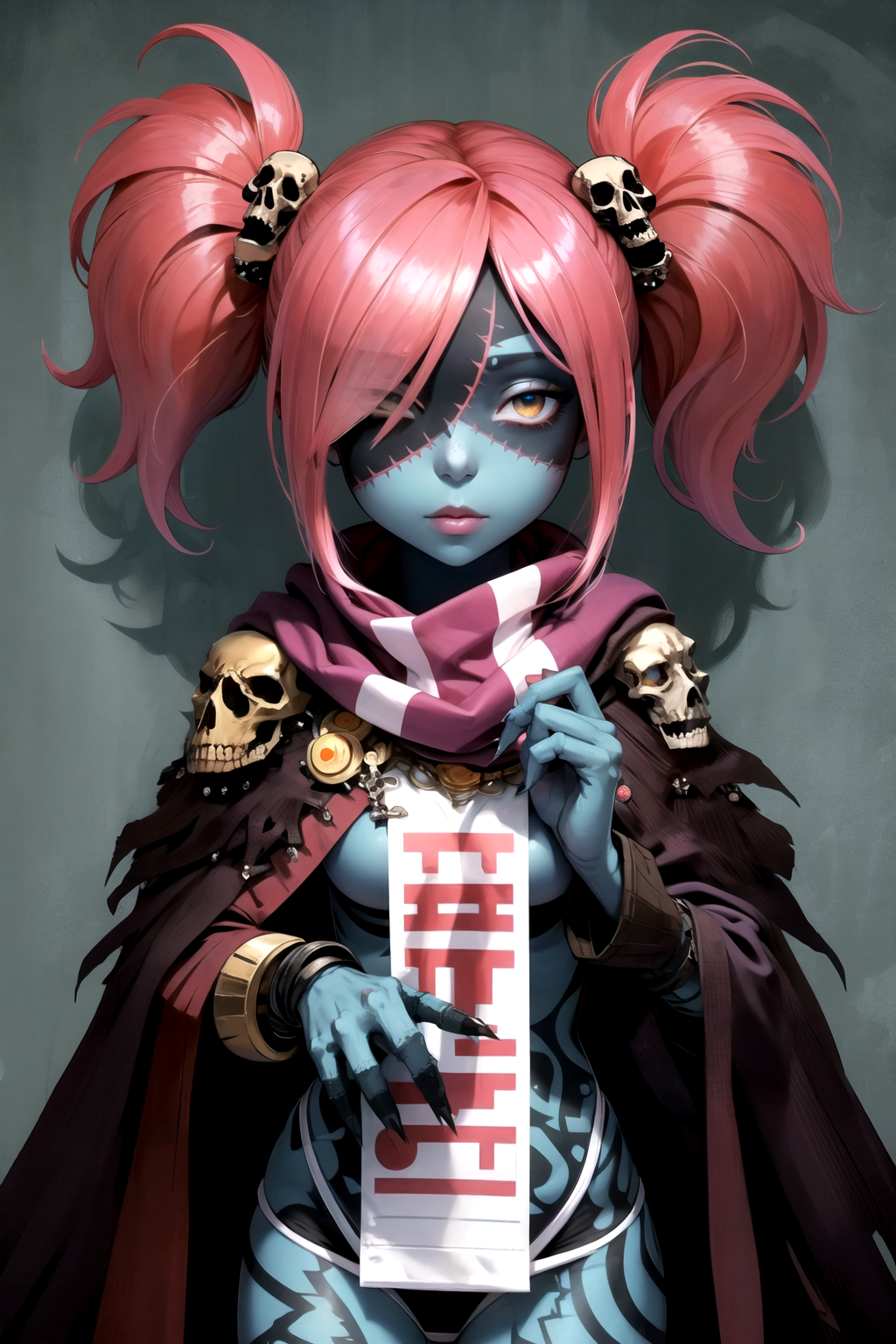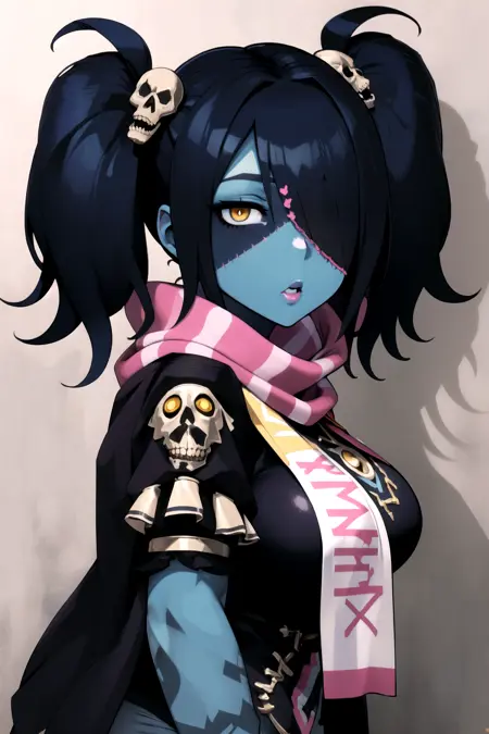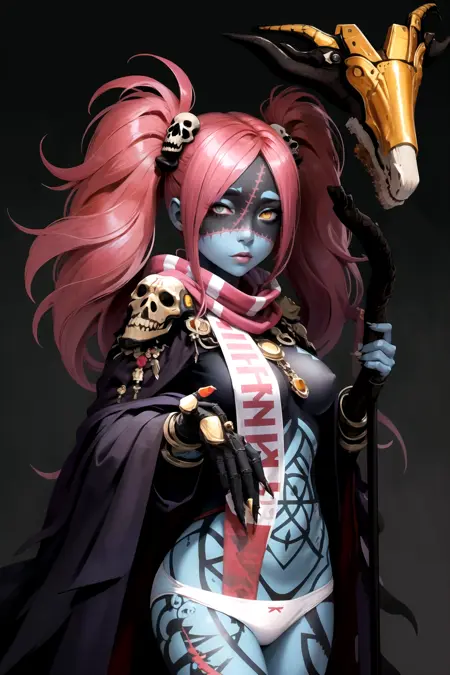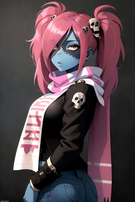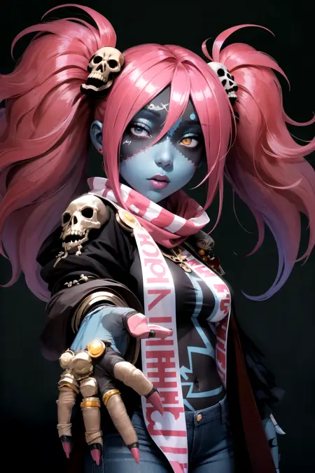 Basic Prompt: lora:LadyZozoV2:1 ladyzozo, (blue_skin:1.2), scarf, pink_hair, twintails, skull_hair_ornament, yellow_eyes, hair_over_one_eye, panties