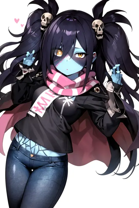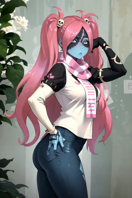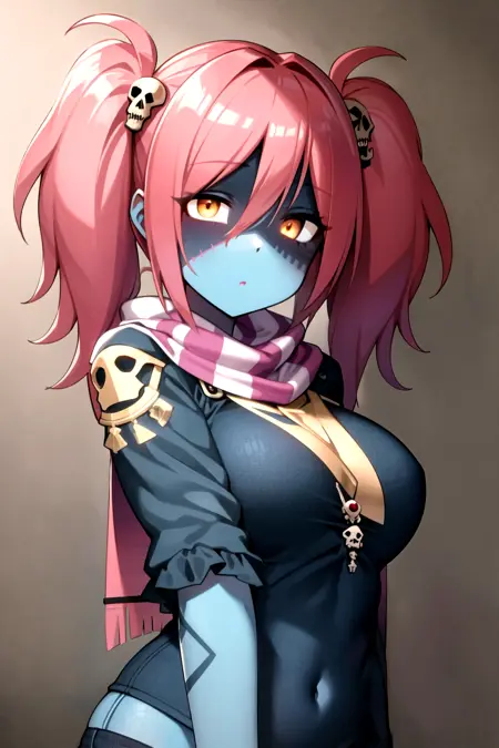 基本プロンプト: lora:LadyZozoV2:1 ladyzozo, (blue_skin:1.2), scarf, pink_hair, twintails, skull_hair_ornament, yellow_eyes, hair_over_one_eye, panties