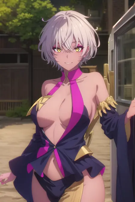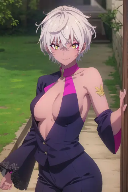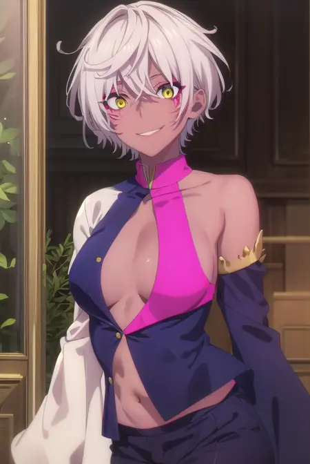 hell、短い髪、(黄色い目:1.3)、白い髪、黒い肌、黒肌の女性、顔の模様、