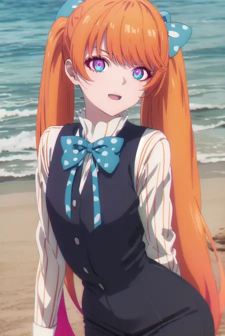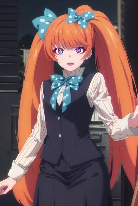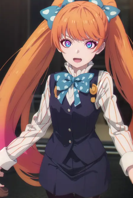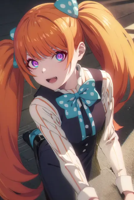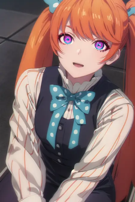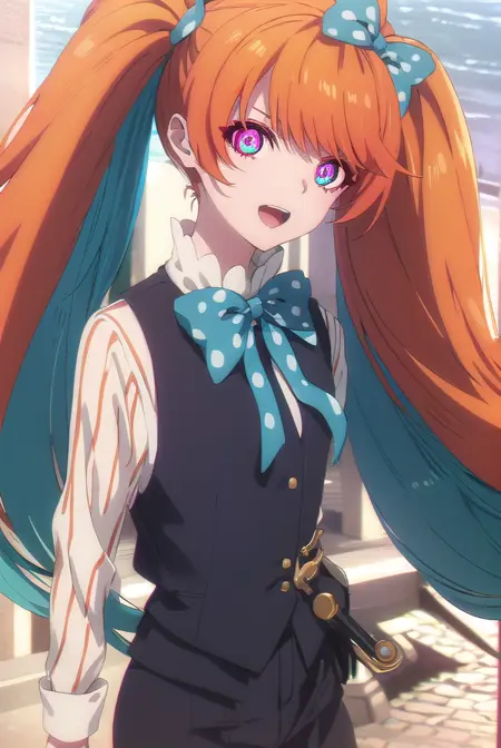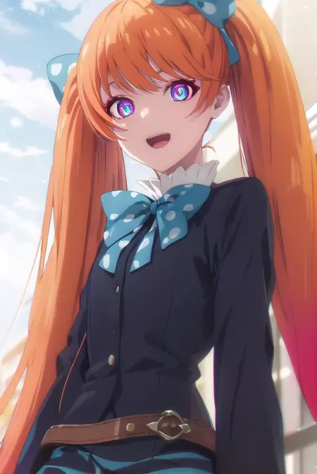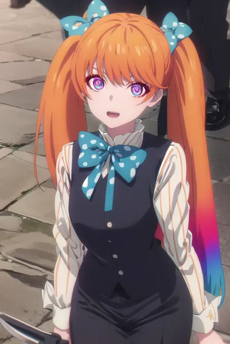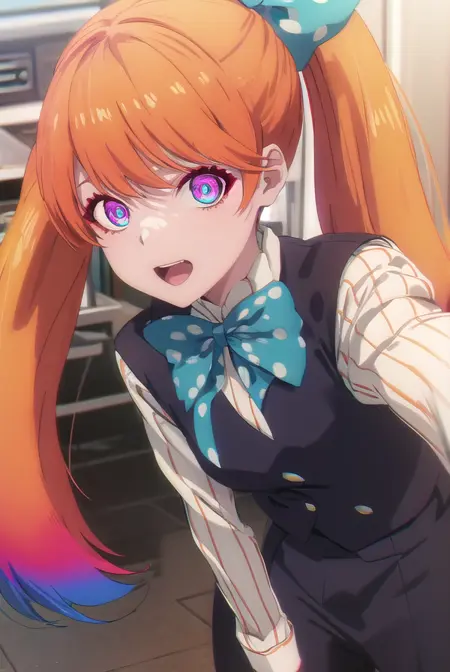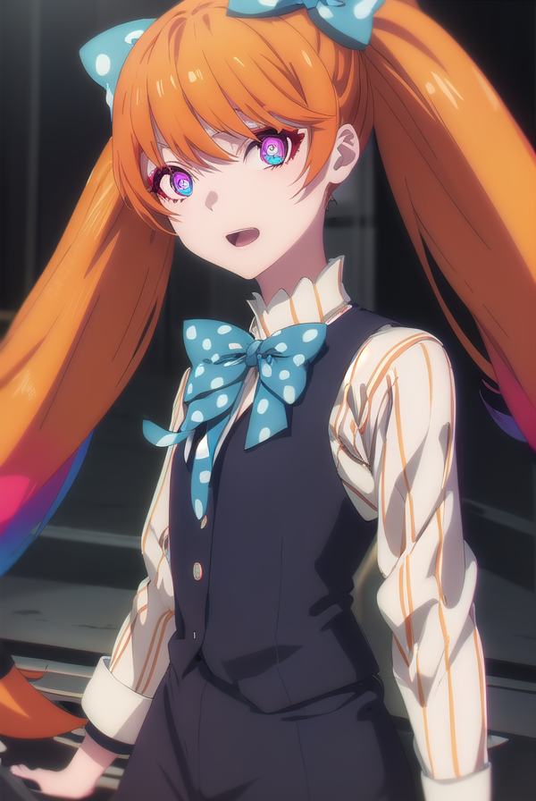 titan, long hair, twintails, very long hair, blue hair, hair bow, multicolored hair, (pink eyes:1.3), orange hair, gradient hair, blue bow, bangs, multicolored eyes, polka dot bow,