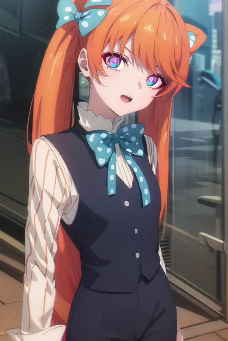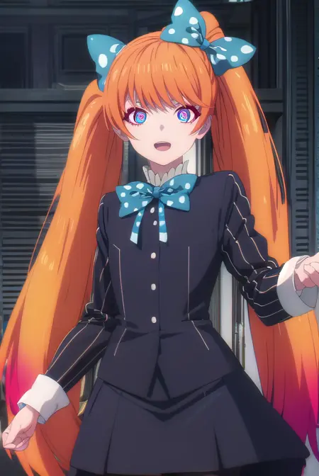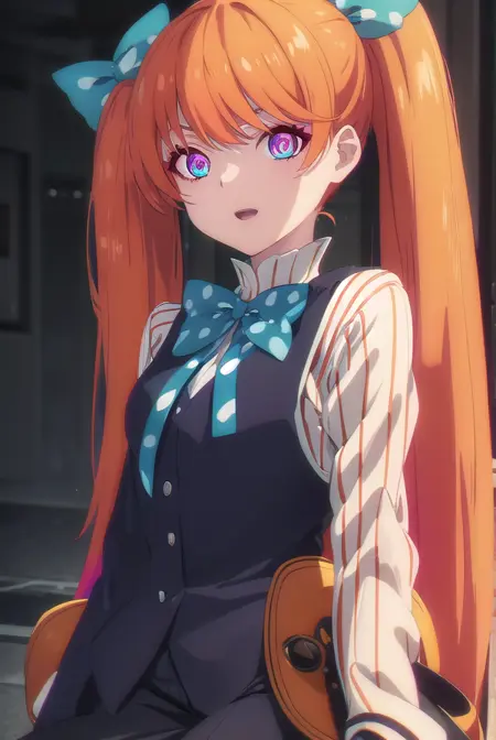 타이탄, 긴 머리, 더블테일, 매우 긴 머리, 파란 머리, 머리 리본, 다색 머리, (분홍색 눈:1.3), 주황색 머리, 그라데이션 머리, 파란 리본, 앞머리, 다색 눈, 도트 리본,