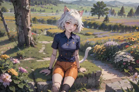 1girl,solo,short hair,animal ears,cat ears,orange eyes,shirt,cat girl,medium breasts,hair between eyes, white hair,shorts,socks,shoes,joints,doll joints,tail,cat tail,blue shirt, orange shorts,kneehighs,slit pupils,black footwear,collared shirt, buttons
