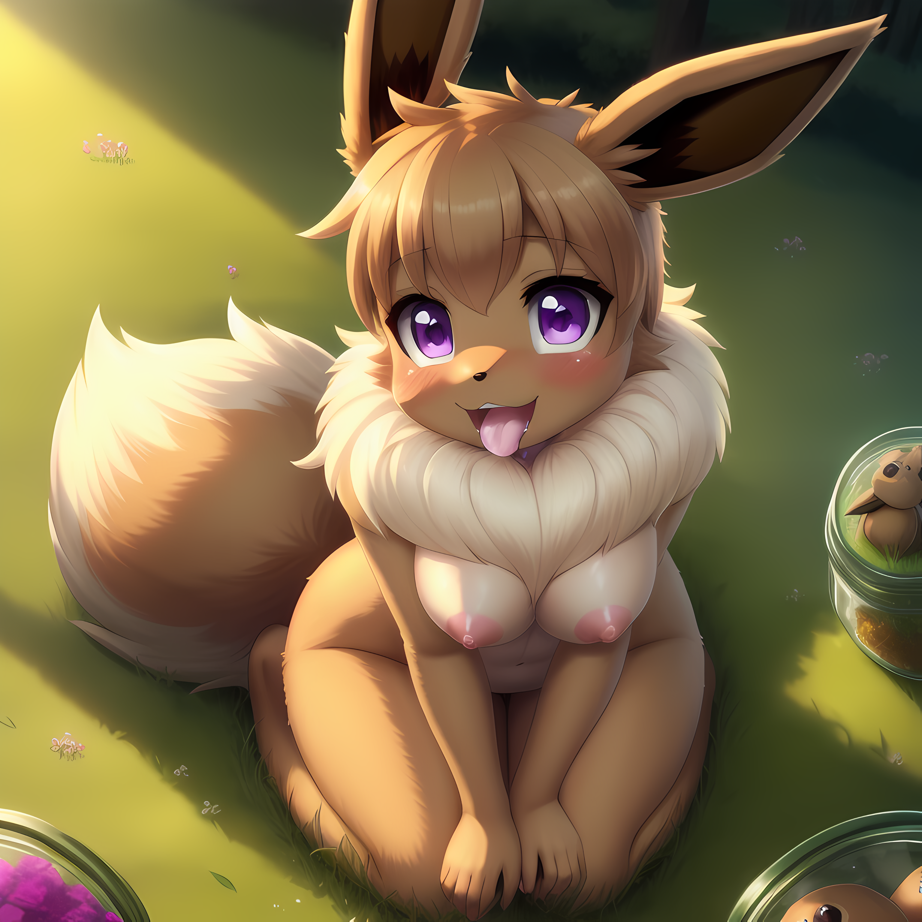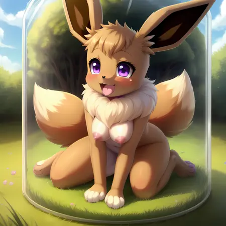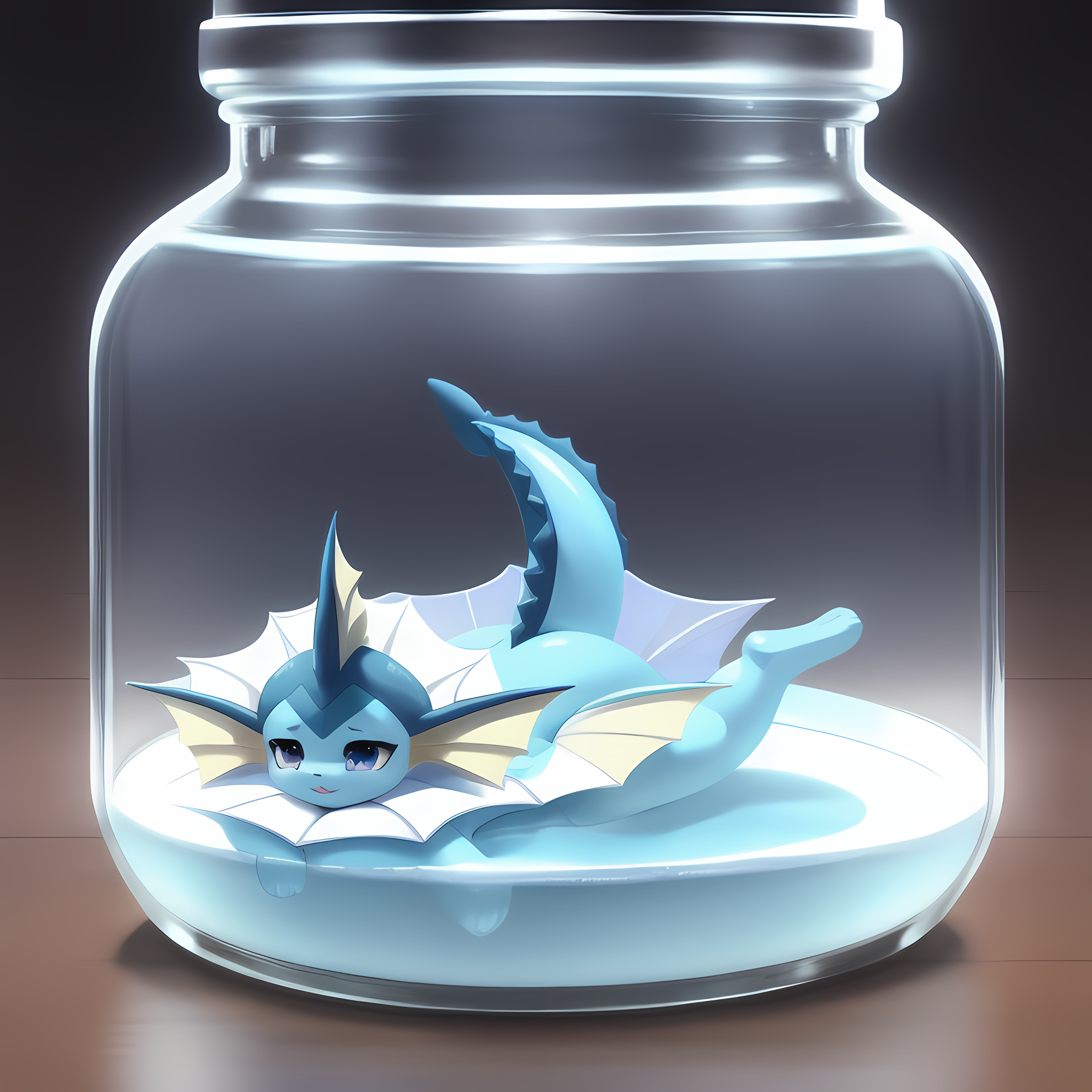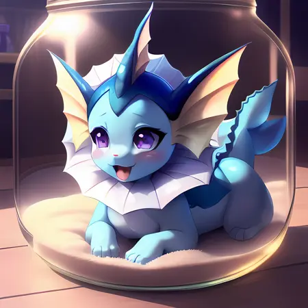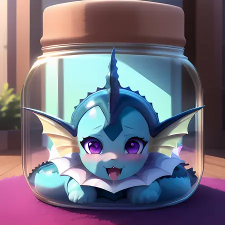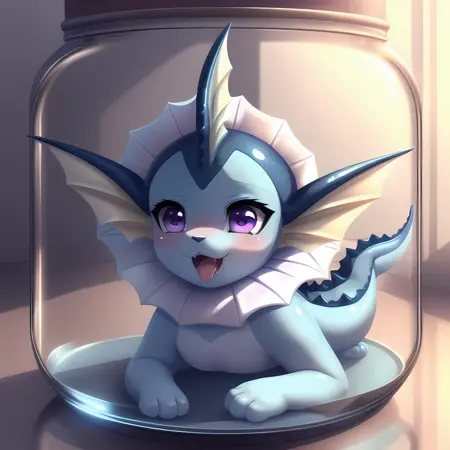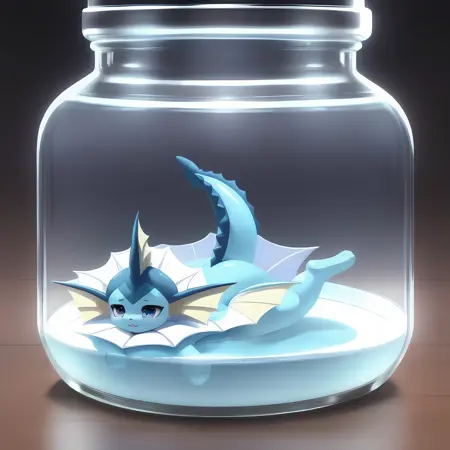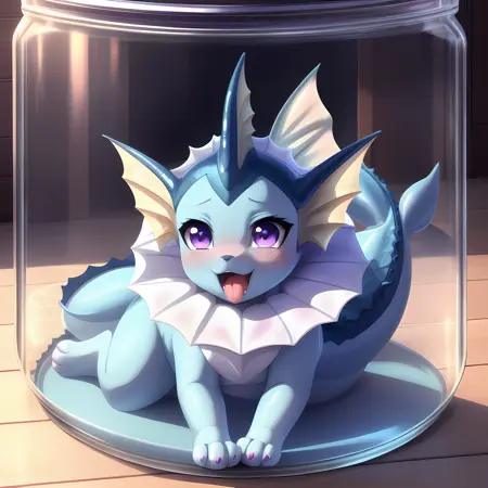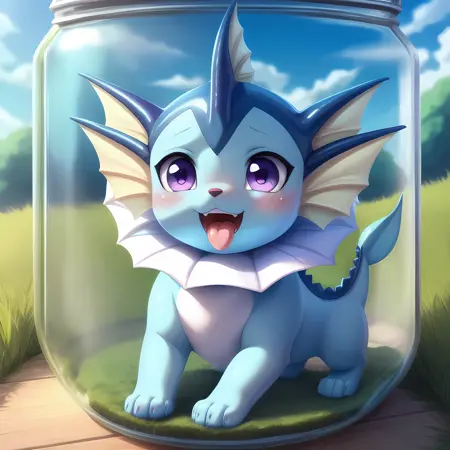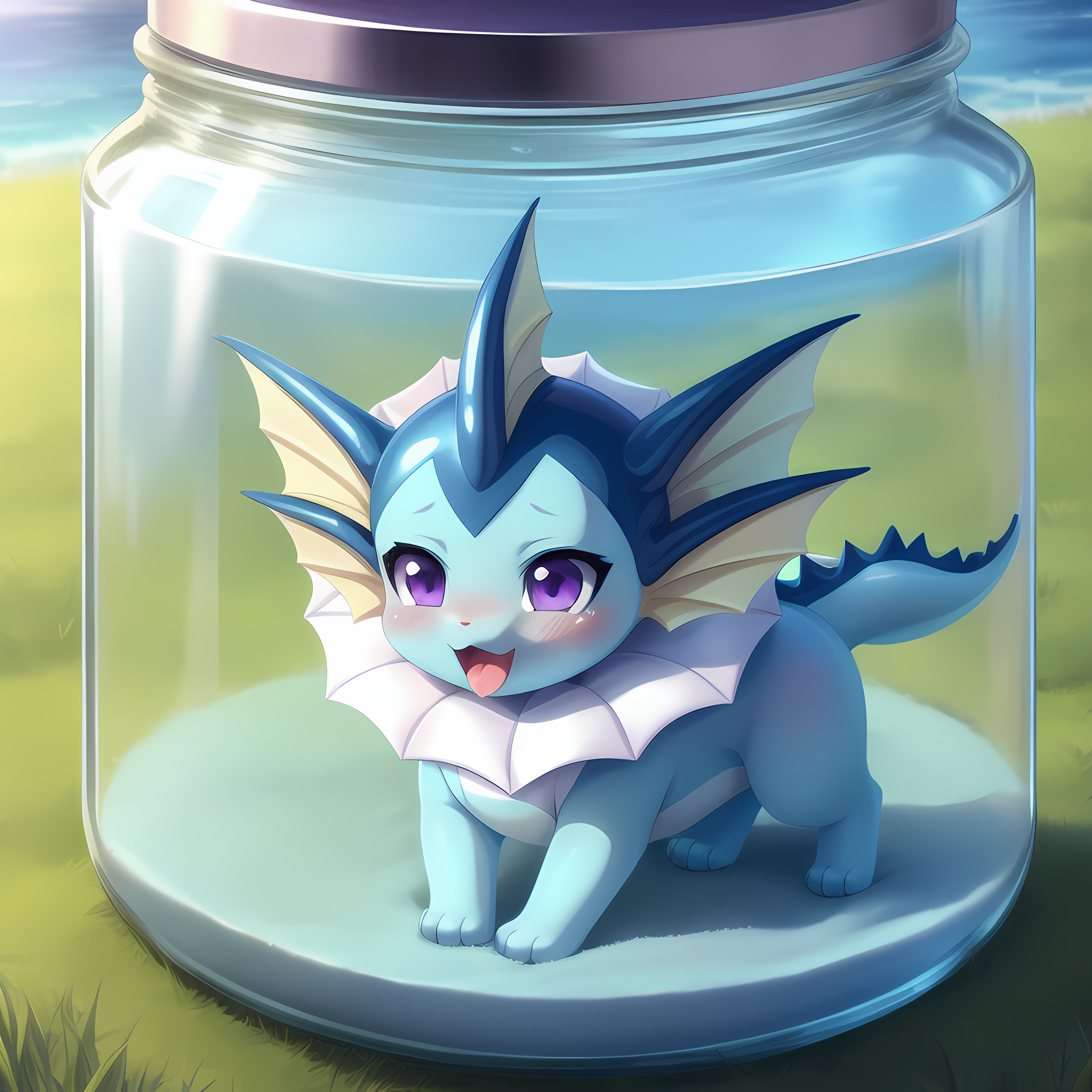 (vaporeon:0.8), in glass jar, shrunken, purple eyes, blush, paws, vaporeon tail, ahegao, looking happy, (best quality, shaded, extreme detail, highly detailed, ultradetailed, intricate, anime), grassy background, lora:eevee\_jar\_v2:0.8