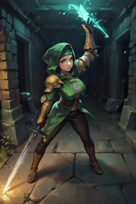 Meliadoul from Final Fantasy Tactics. Not many hang-ups on this one from what I can tell. To render her with her hood down, simply remove "hood" from the prompt.
