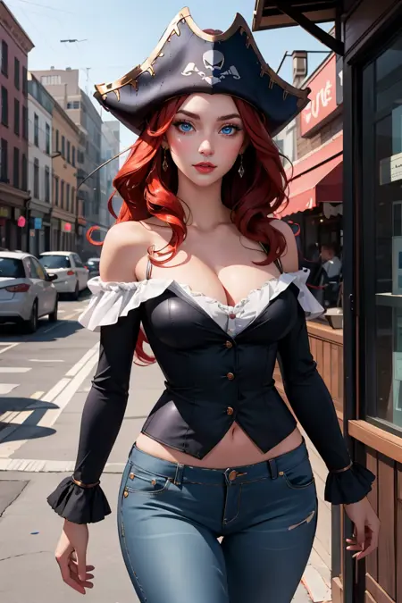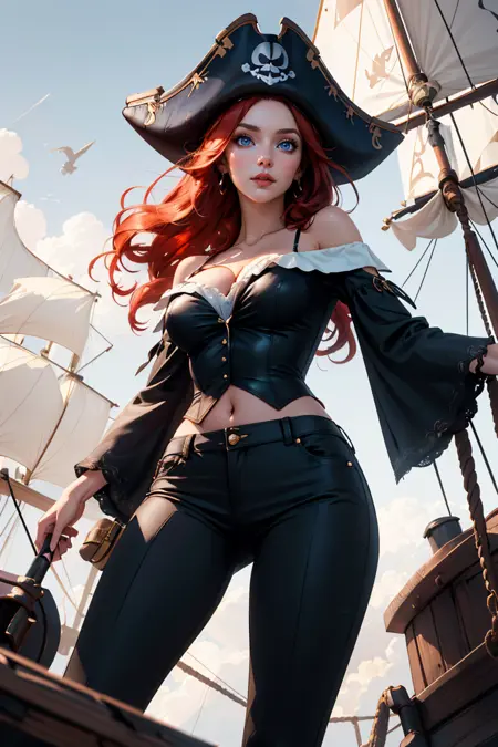 Outfit words: pirate hat, off shoulders, black pants, wide sleeves