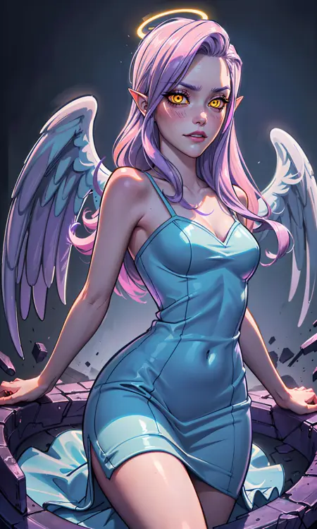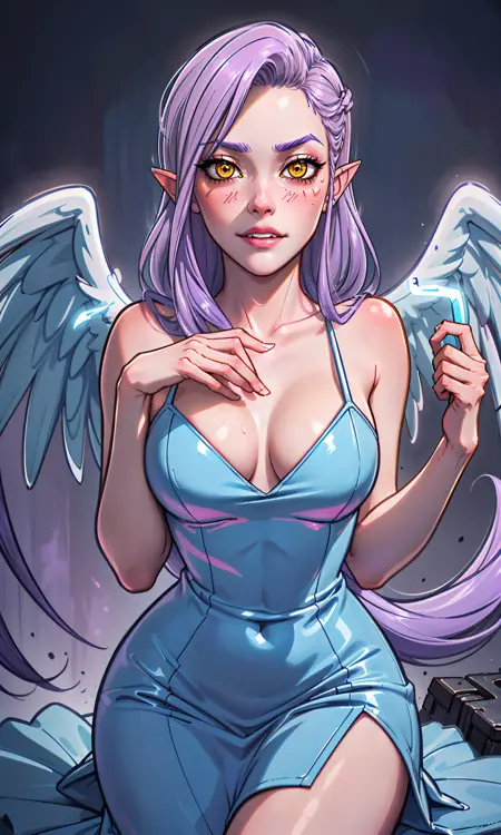 Recommend using: 0.7 strength.Trigger Word: VioletAngel_(Darmchirk),Recommended Tags: purple hair,pointy ears,halo,yellow eyes,angel wings,dress,