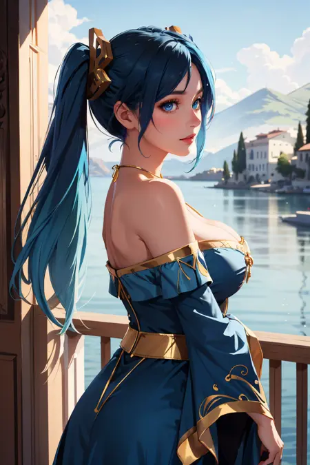 Outfit words: off shoulder, blue dress with gold trim, cleavage, wide sleeves