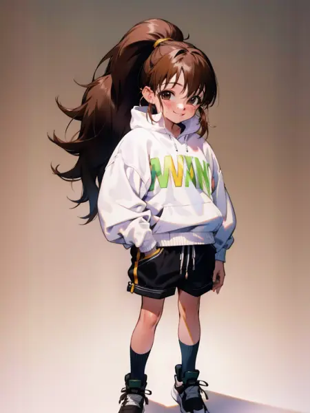 Taneshima Popura - popura, brown hair, long hair, high ponytail (add either medium breasts for her canon size, or large/huge breasts to emphasize the shortstack trait) (don't let the mods know, but adding 'loli' to Popura also helps to emphasize her being a shortstack)
