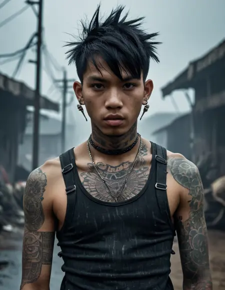 Lower CFG will result in a bit more grimy, broken down, dilapidated look - whereas higher CFG will make a crisper, cleaner, and shinier style (though you can of course prompt otherwise). This came from the LoRAs I merged in, and I thought it was a neat effect / look. I enjoy 3-4 CFG for this one for people, or 5-6 CFG for landscapes. When describing a prompt, putting the style/scene/landscape at the start helps.