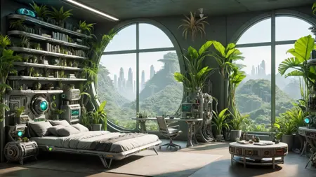 Lower CFG gives more of a "concrete and mesh" futuristic style while higher CFG trends towards a sleeker "chrome and armor" futuristic style. I enjoy 4 CFG for people, 6 for landscapes. When describing a prompt, putting the style/scene/landscape at the start helps.