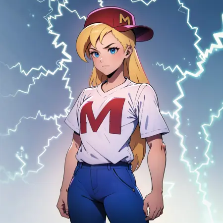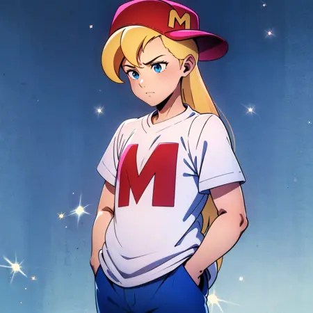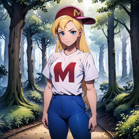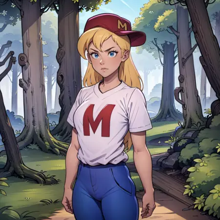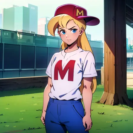 1girl, solo, Maxine, blonde hair, long hair, red hat, white shirt, blue eyes, short sleeves shirt, baseball cap, blue pants, white shoes,