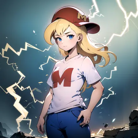 1girl, mighty max, blonde hair, long hair, red hat, white shirt, blue eyes, short sleeves shirt, baseball cap, blue pants, white shoes,