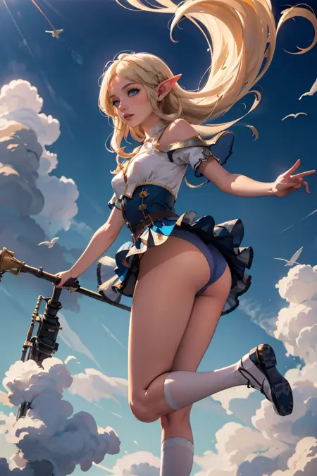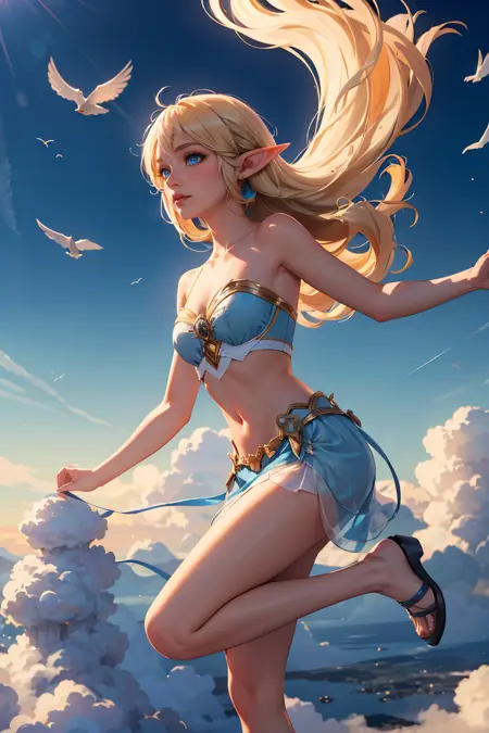 Outfit words: off shoulder, blue dress with gold trim, cleavage, wide sleeves