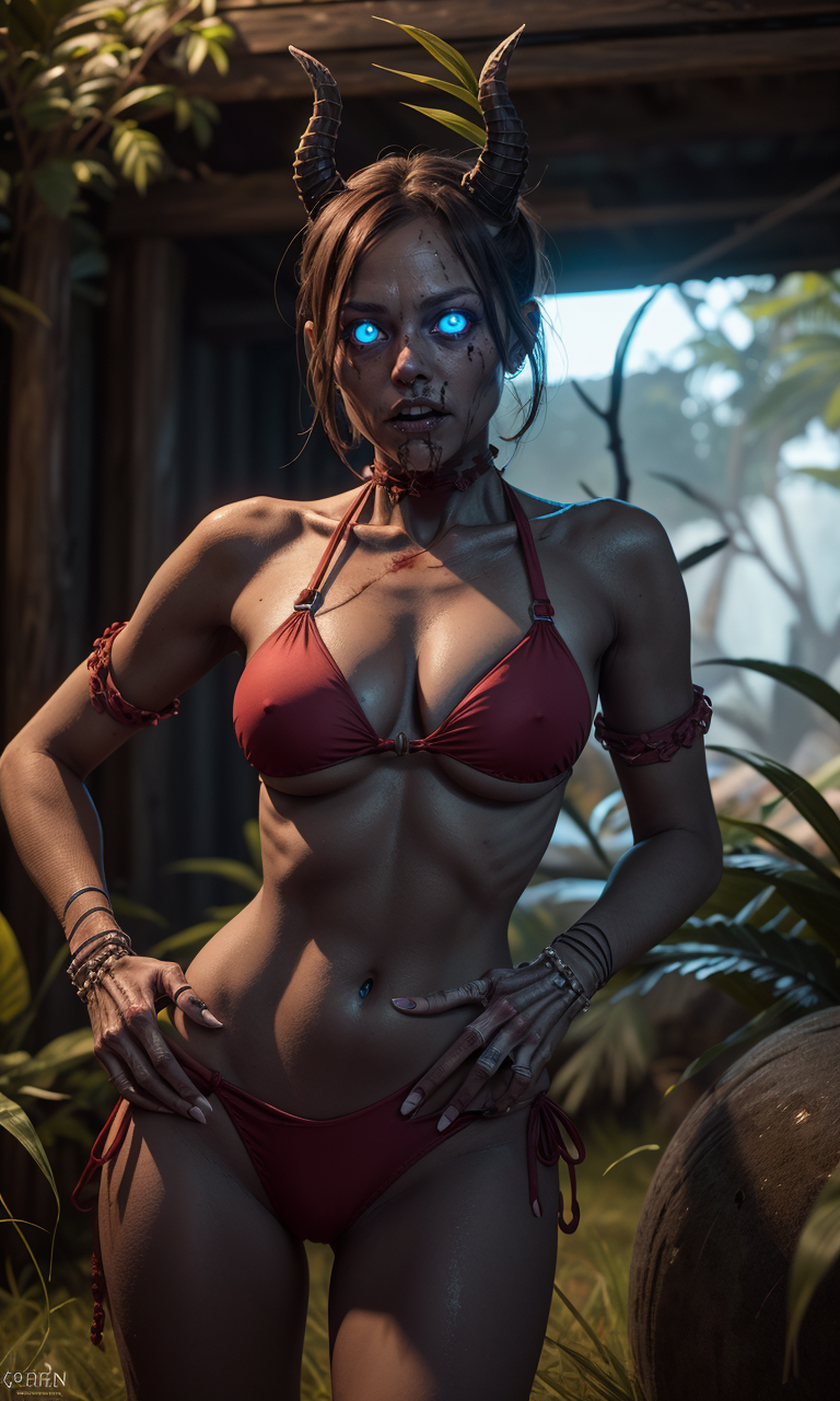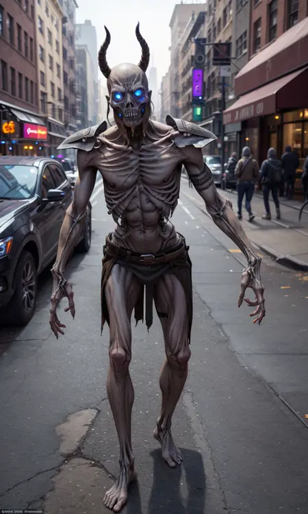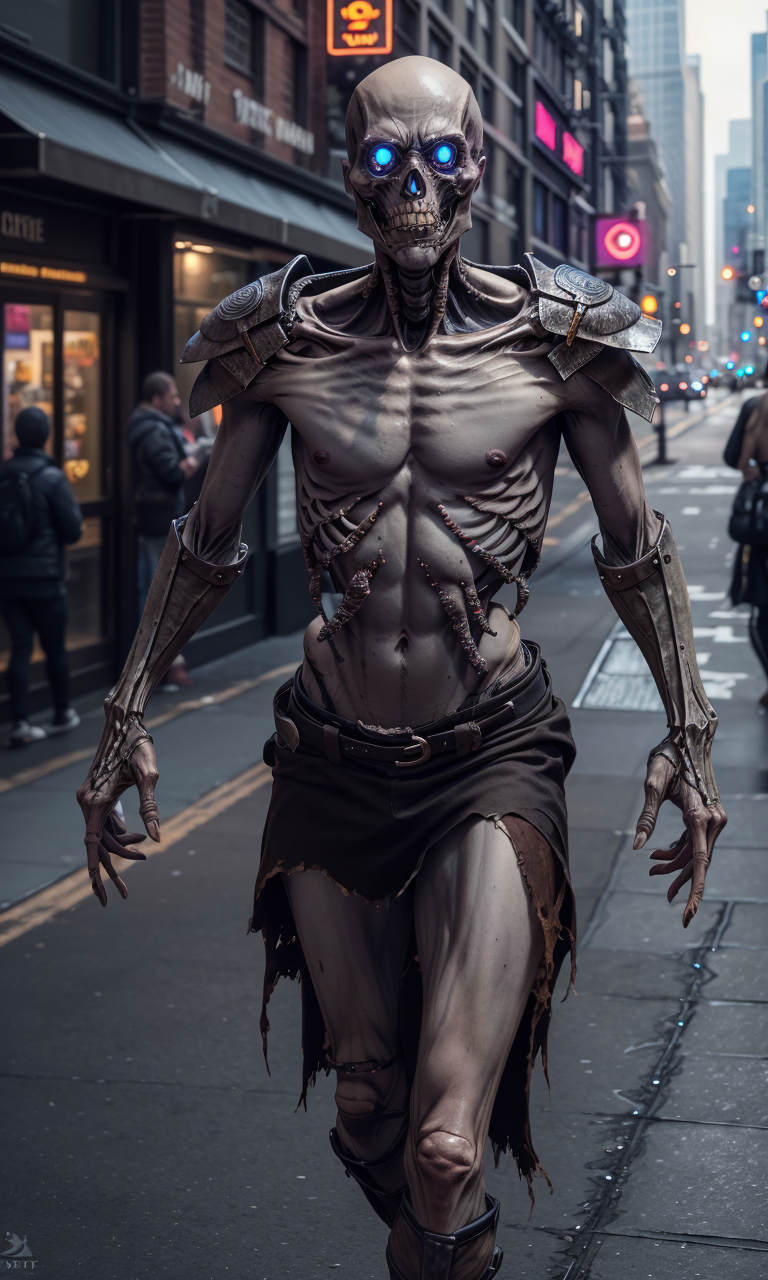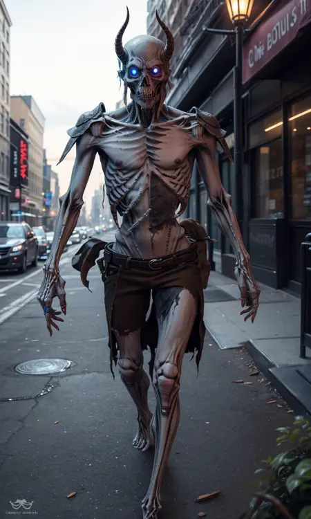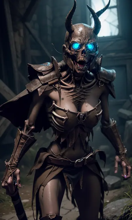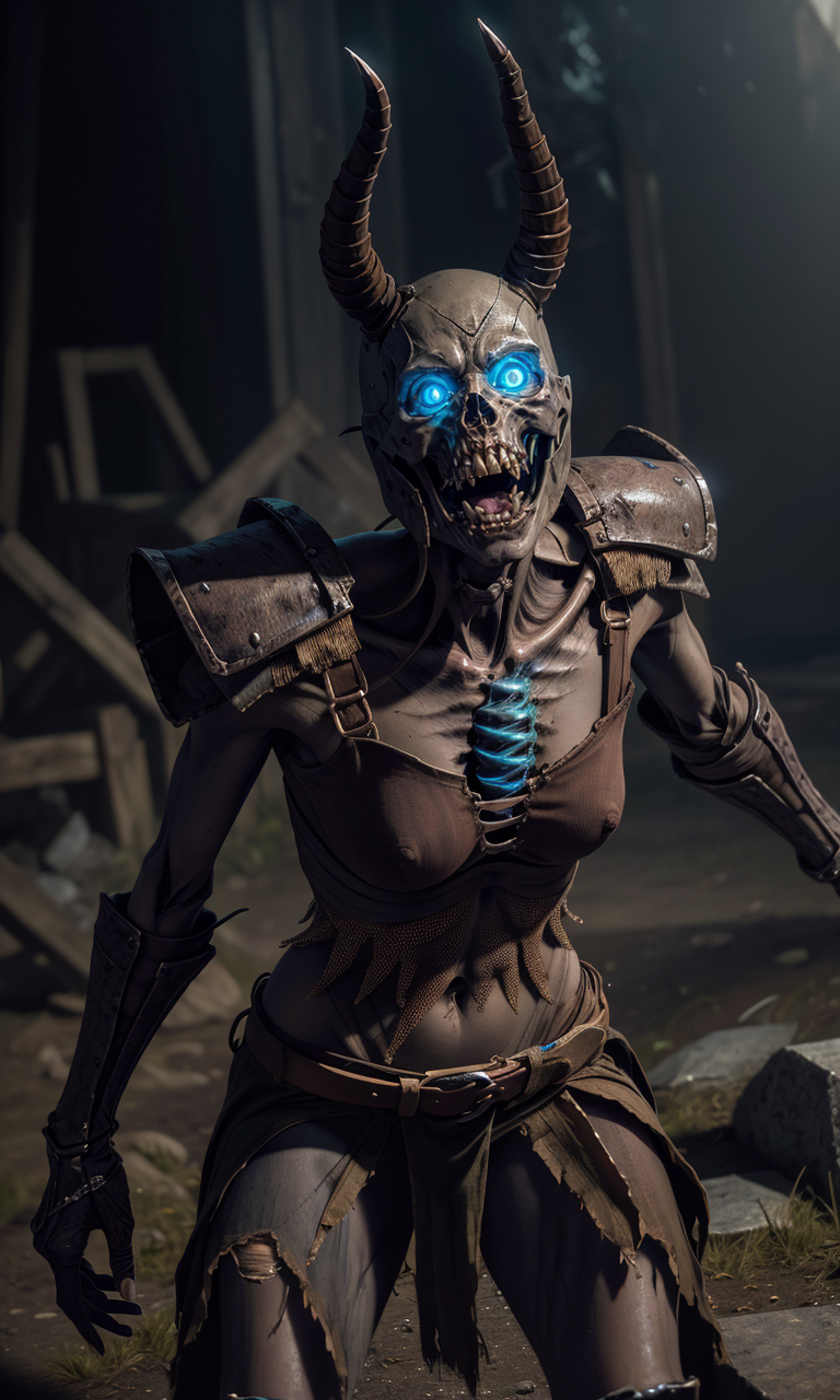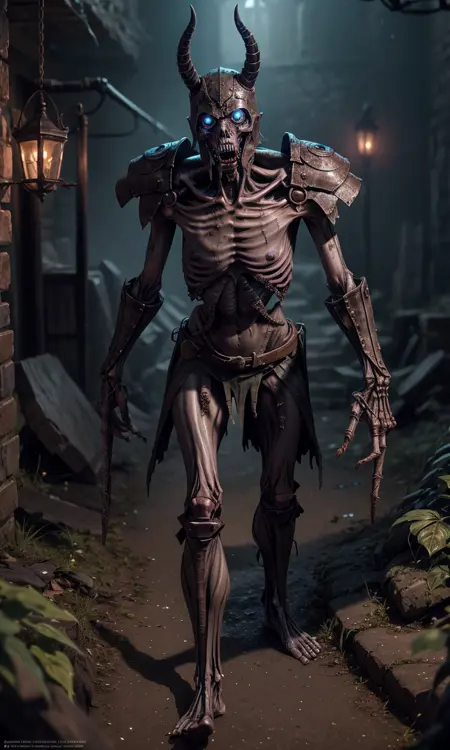 Good prompts to use, rib cage, skeletal, helmet, armor, skinny, bones, decay, rotting flesh, glowing eyes.