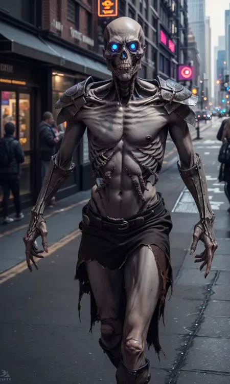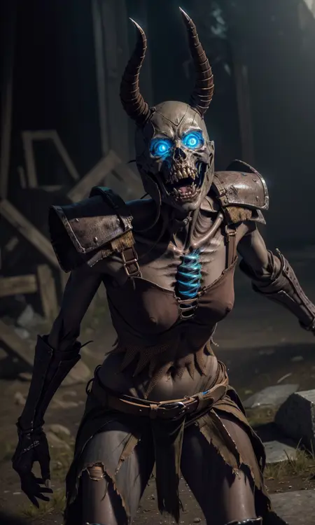 効果的なプロンプト:肋骨、骨格、ヘルメット、防具、痩せている、骨、劣化、腐敗した肉、光る目。