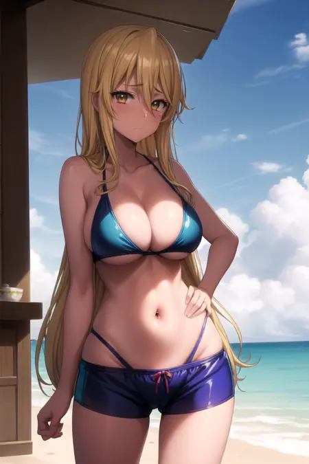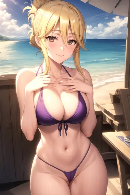 shizuka_bikini: 「ゾンビドリフターズ」OVAで着ていた水着の再現に使用し、 ストラップ付きビキニ、ストリングビキニ、マイクロビキニ、フロントリボントップ、ブルーがかった紫のビキニ と併用すれば正しい形になります。他の下着/水着を避けるには、このタグをネガティブプロンプトに記入してください。