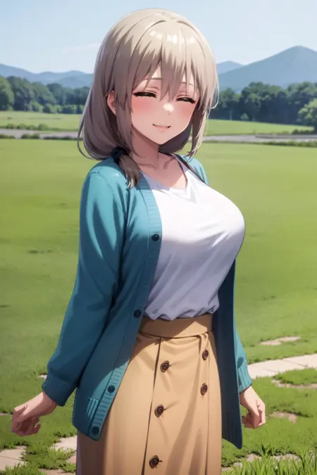 Default outfit prompts : blue open cardigan, brown skirt, shirt