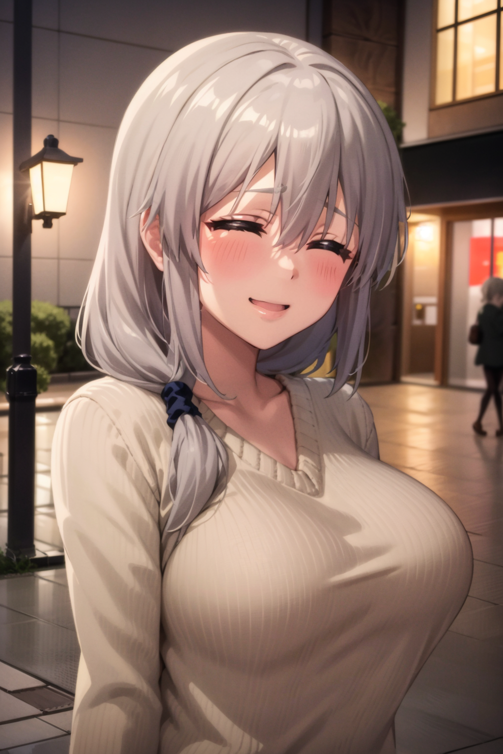 Basic prompts : 1girl, grey hair, hair over shoulder, hair between eyes, closed eyes, mature female, large breasts, long hair