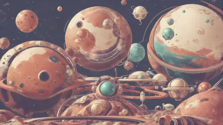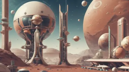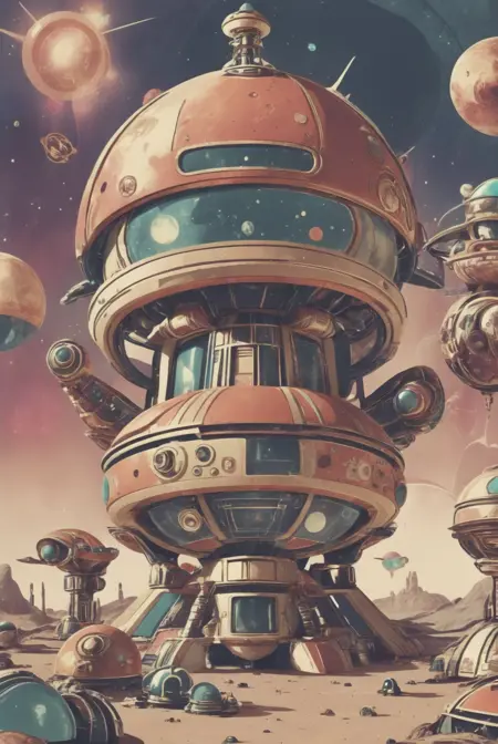 화성의 도시와 정착지를 상징하는 레트로 공상과학 예술에서 영감을 받은 건축 스타일.