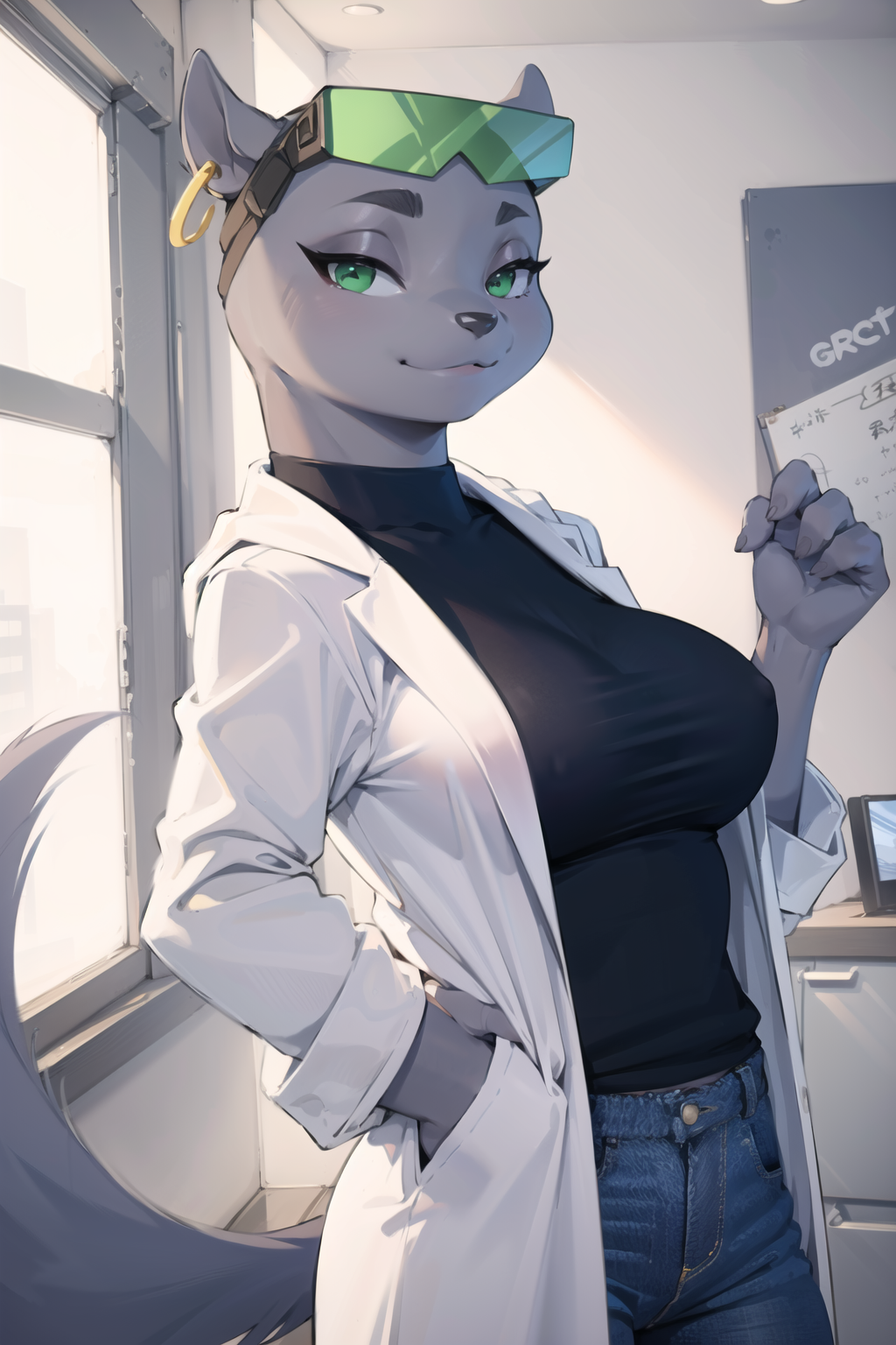 1 girl, solo,marie_itami,mink girl, grey skin, furry female, animal nose, green eyes, black puplis, animal ears, earrings, eyewear on head, (tail)
