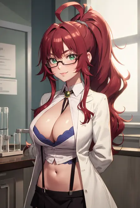 For tall kusuri use: t_kusuri_wz, long hair, red hair, ponytail, green eyes, glasses, semi-rimless eyewear, cleavage, bra, large breasts, suspenders, white labcoat, ahoge, black skirt, miniskirt, navel, shirt, smile, suspender skirt
